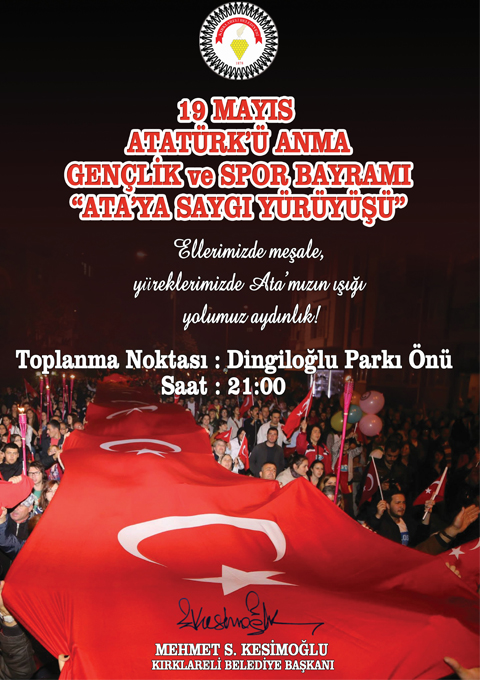 Kırklareli Belediyesi tarafından düzenlenecek "Ata’ya Saygı Yürüyüşü" 19 Mayıs Salı akşamı saat 21:00’da Dingiloğlu Parkı önünden başlayacak. Kırklareli Belediyesi tarafından dağıtılacak 500 meşale ile Dingiloğlu Parkı önünden başlayacak kortej yürüyüşü, Karaumur Caddesi, Hastane Caddesi, 100. Yıl Caddesi, Vilayet Meydanı, İstasyon Caddesi güzergahında devam ederek Festival Alanında son bulacak.